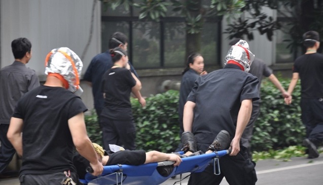 成立搜救小組對廠區(qū)內(nèi)未及時逃離火災(zāi)的“受傷受困”人員進行搜救,經(jīng)過仔細尋找搜索,成功搜救出一名受困者,用擔(dān)架將其抬出,抬至安全集散地先進行初步“搶救”。目的是為了培養(yǎng)員工的搜救技能,以及安全意識。