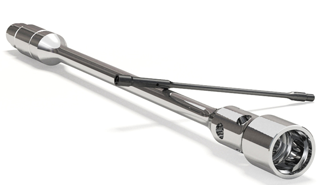噴吸鉆外形的切削刃交錯分布在精密零件加工鉆頭的兩側(cè),頸部有噴射切削液的小孔,前端有兩個喇叭形孔,切屑在由小孔噴射出的高壓切削液的壓力作用下,從這兩個喇叭形孔沖入并吸出空心刀桿向外排出。