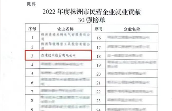 2023年3月10日,株洲市人力資源和社會保障工作會議在市人力資源和社會保障局召開。會議為“2022年度主軸市民營企業就業貢獻30強”進行了授牌頒獎,本次表彰共授予株洲市30家企業“就業貢獻獎”稱號,西迪技術股份有限公司榮獲“2022年度株洲市民營企業就業貢獻獎”稱號。