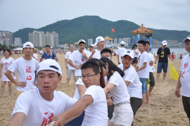 拔河比賽是適合團(tuán)隊(duì)培養(yǎng)凝聚力的活動(dòng),在細(xì)膩柔軟的沙灘上,有碧海藍(lán)天做背景,是不是更適合拔河,我們要更拼出我們的團(tuán)結(jié)我們的力量來,不能辜負(fù)海陵島這美麗的海景啊!
