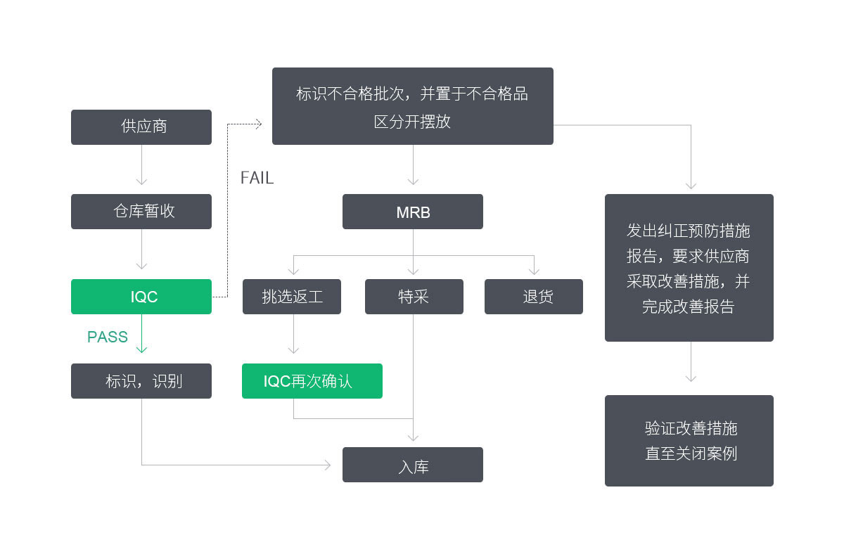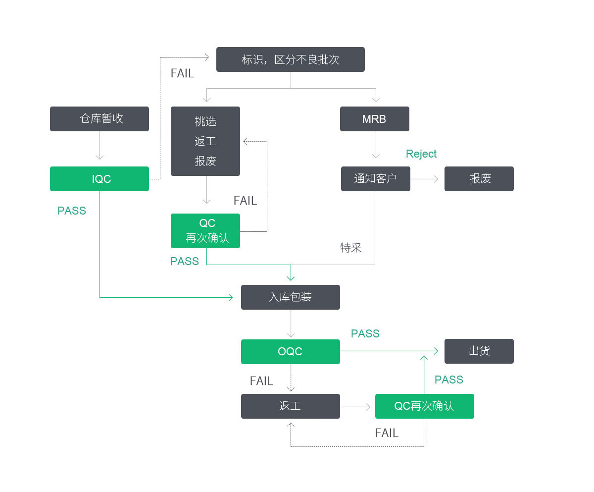 建立健全的質(zhì)量管理制度,針對生產(chǎn)加工控制過程建立來料檢驗(yàn)(IQC),過程檢驗(yàn)(IPQC),終檢(FQC),出貨檢驗(yàn)(OQC)四個階段檢驗(yàn),全方位控制產(chǎn)品質(zhì)量。嚴(yán)格控制原材料質(zhì)量,嚴(yán)格執(zhí)行各工序的工藝參數(shù),嚴(yán)格執(zhí)行檢驗(yàn)過程,依據(jù)檢驗(yàn)規(guī)范及客戶要求等進(jìn)行有序管控,確保產(chǎn)品出貨質(zhì)量滿足客戶需求。